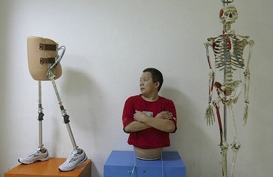 Peng Shulin, a Chinese man, was hit by a truck, as a result of which he lost his lower body. His chances of survival were minimal, but skilled doctors performed several operations and managed to bring Shulin back to life.Some time later, special prostheses with biotic legs were developed for the man, thanks to which he can move around.