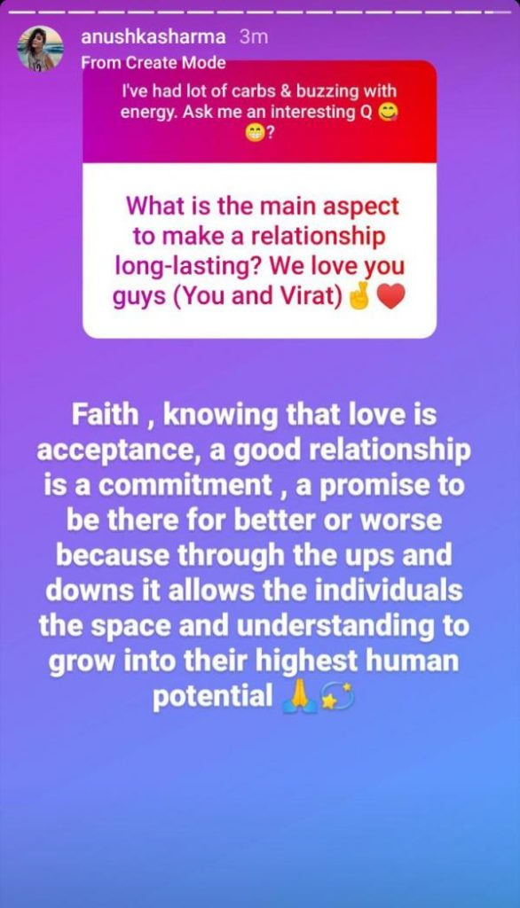 “Pari” film actress Anushka Sharma shared her view on the long-lasting relationships during an interactive session on Instagram. Let’s check out.