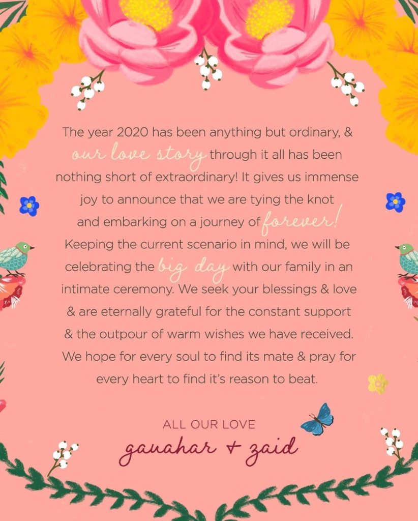 The couple is all set for their big day now and the proof of which are the photos that were posted on December 1, 2020. This was from their pre-wedding shoot at a Mumbai hotel, in which they were seen in traditional attire and looked quite fab. Along with posting the picture she also wrote “The year 2020 has been anything but ordinary, and our love story through it all has been nothing short of extraordinary! It gives us immense joy to announce that we are tying the knot and embarking on a journey of forever! Keeping in mind the current scenario, we will be celebrating the big day with our family in an intimate ceremony. We seek your blessings and love and are eternally grateful for the constant support and the outpour of warm wishes we have received. We hope for every soul to find its mate and pray for every heart to find its reason to beat. All our love, Gauahar and Zaid.”