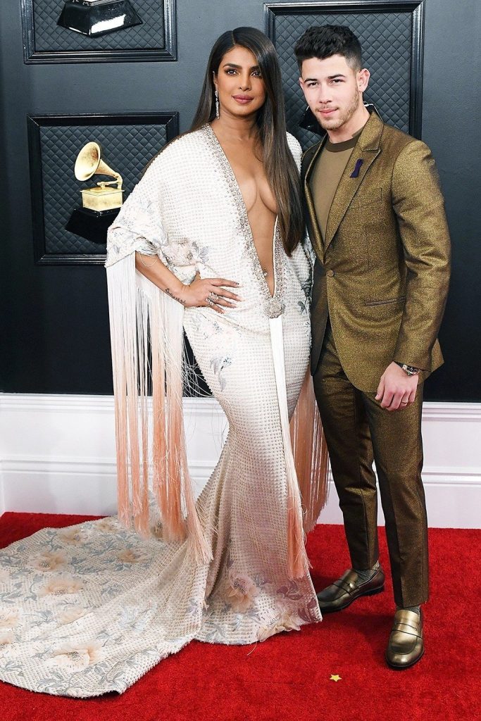 The next one on the list is Priyanka Chopra who appeared at Grammy 2020 And was seen in a white dress that has a neckline, showing her cleavage and went down straight to her belly button.