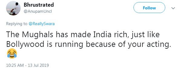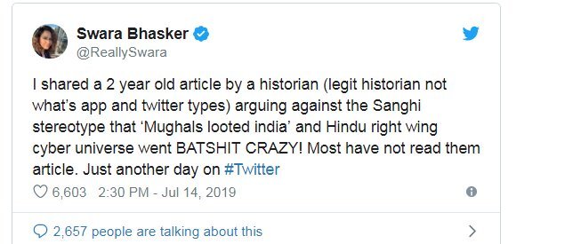 Swara Bhasker often gets targeted by social media users for her sharp views on social and political issues prevailing in the country. Recently this happened again. The actress once again receives flak from social media users for her recent tweet. She took to Twitter to share an article titled ‘Mughals’ didn’t loot India’. She also expressed her thought and wrote- “Mughals made India rich.. #history #fact”.