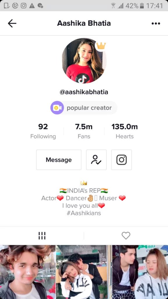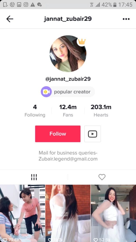 Zubair is an Indian Television actress who is just 17 years old is one of the famous ticktock stars. Zubair has been seen in many Television serials and some films too. Jannat is the most popular Indian female Tik Tok user of 2019 in terms of the fan with 12.4m fan.