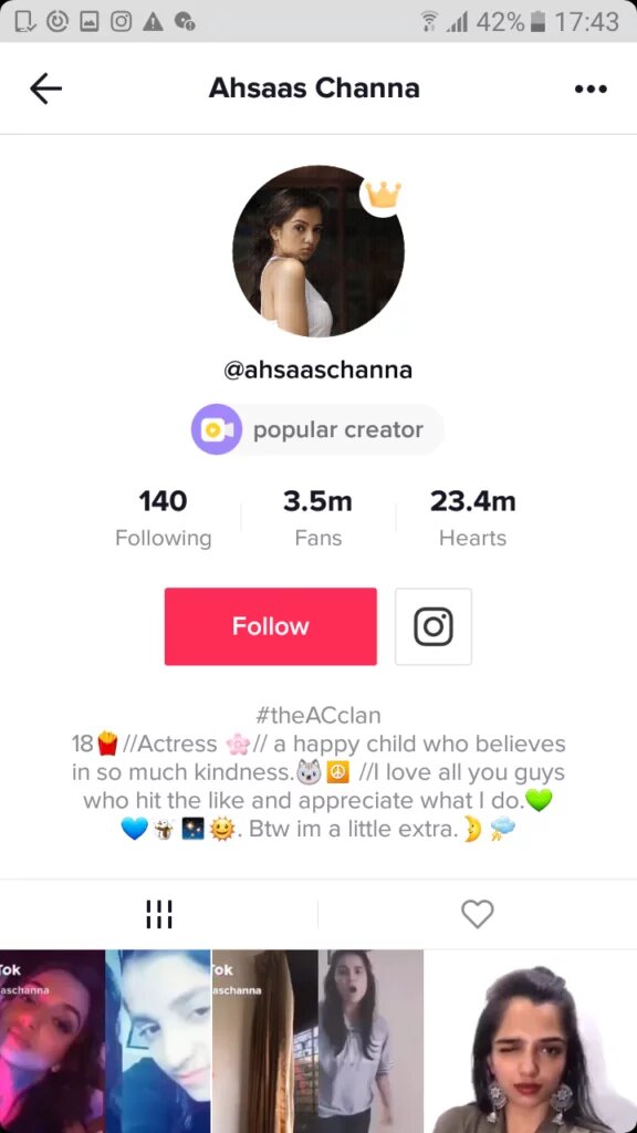 Ahsaas is a film actress who previously appeared in film Vaastu Shastra Kabhi Alvida Naa Kehna, My Friend Ganesha, Phoonk, etc as a child artist. Channa has the fan following with 3.5 m fans on her Instagram. Follow her to enjoy her entertaining videos on Tik Tok.