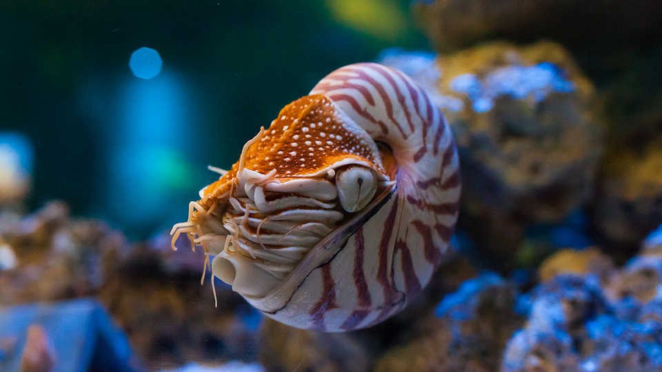 The chambered nautilus, Nautilus pompilius. Steinhart Aquarium, California Academy of Sciences. Photos by Kathryn Whitney. Copyright- California Academy of Sciences, all rights reserved.