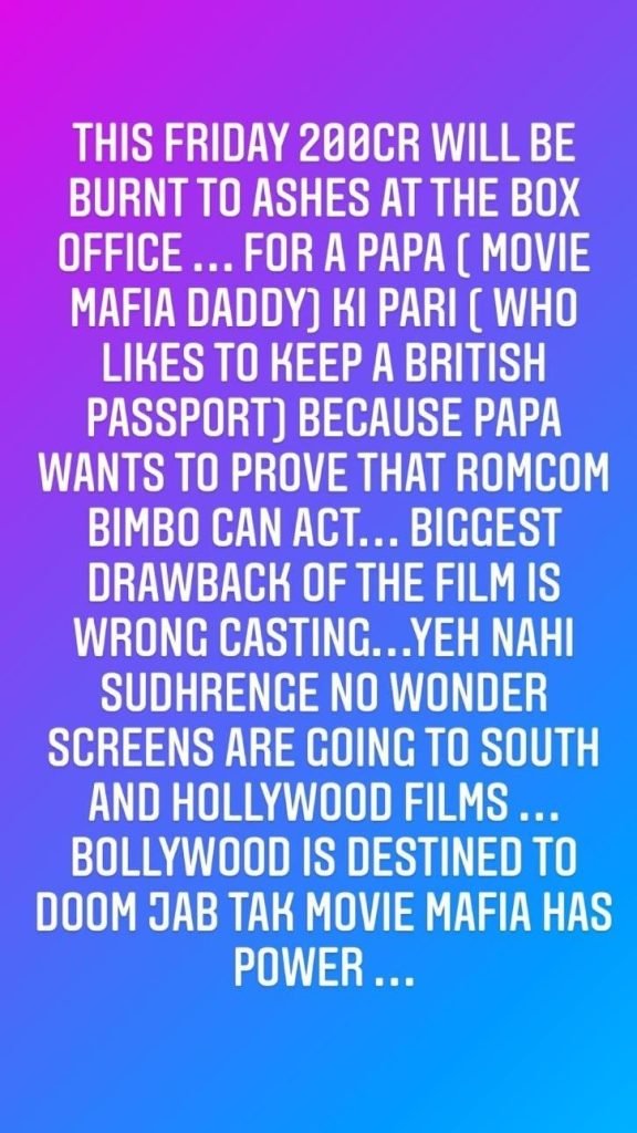 Without taking the names she said that the film has a very wrong casting. Moreover, she also took to her Instagram stories to openly wrote: “This Friday 200cr will be burnt to ashes at the box office … for a papa (movie mafia daddy) ki pari (who likes to keep a British passport) because papa wants to prove that romcom bimbo can act… biggest drawback of the film is wrong casting…yeh nahi sudhrenge (these people won’t change) no wonder screens are going to South and Hollywood films … Bollywood is destined for doom jab tak movie mafia has power…”