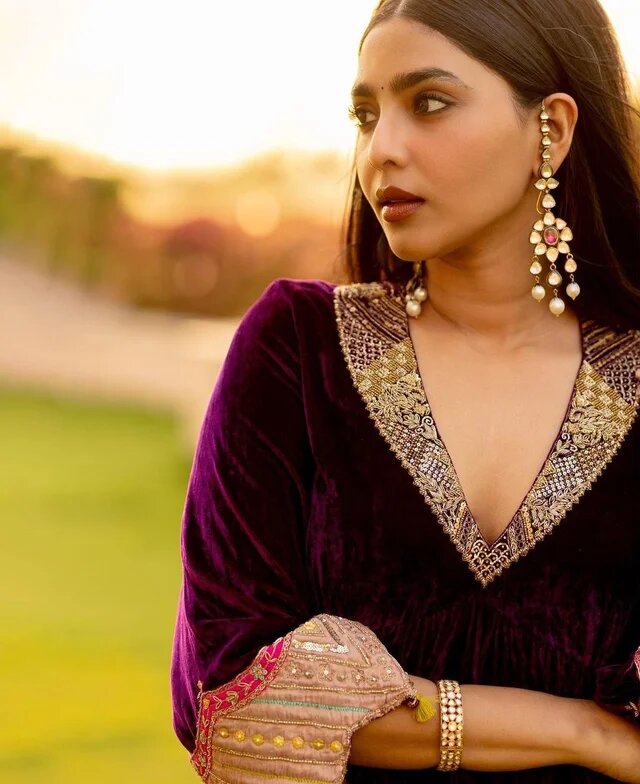 In this picture, Aishwarya Lekshmi is sporting a purple silk velvet kurta. It is worn by the beauty with an embroidered palazzo. The bell sleeves and plunging neckline are ideal for the climate. The middle part, matte makeup, strong lips, and kundan earrings with chain brought the entire ensemble together.