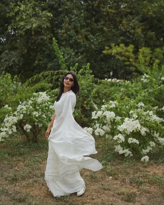 Whites are monotonous? Actually not at all. The ‘Ponniyin Selvan 2’ actress is donning a jasmine-white silk organza saree. The saree has embroidery, which give the cloth greater dimension overall. Aishwarya Lekshmi enhanced the classic saree by wearing a pair of drop earrings. Her unmade-up appearance and unkempt ponytail give the entire ensemble a fashionable edge.