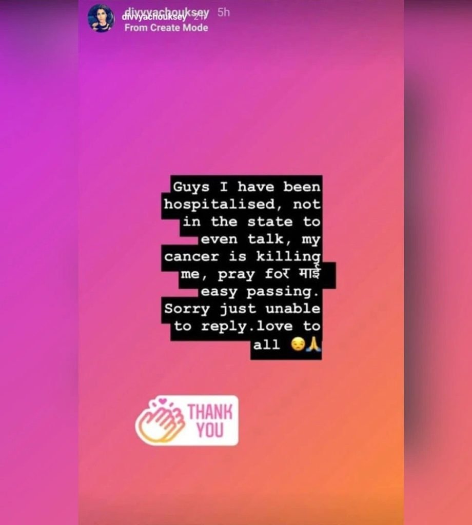 The young actress Divya Chouksey who was just 29 years old. Passed away after she lost her battle with cancer.
