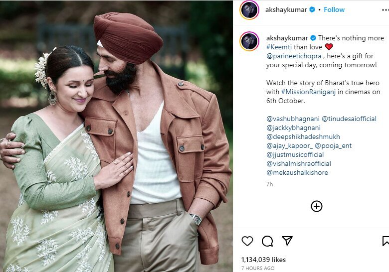 On October 2, Akshay Kumar posted a lovely photo of him and Parineeti Chopra from his forthcoming movie Mission Raniganj: The Great Bharat Rescue to his Instagram account. He also shared information about the movie’s upcoming romantic song, Keemti. The actor from Khiladi uploaded a photo of the song’s Mr. & Mrs. Gill, played by Akshay Kumar and Parineeti Chopra, hinting at a romance subplot in the film. The song, which will be released tomorrow, will be given to Parineeti as a “gift” on her “special day,” Akshay penned down, “There’s nothing more #Keemti than love @parineetichopra , here’s a gift for your special day, coming tomorrow! Watch the story of Bharat’s true hero with #MissionRaniganj in cinemas on 6th October. @vashubhagnani @tinudesaiofficial @jackkybhagnani @deepshikhadeshmukh @ajay_kapoor_ @pooja_ent @jjustmusicofficial @vishalmishraofficial @mekaushalkishore.”