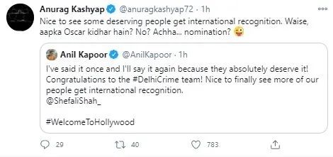 Anil Kapoor’s tweet praising Shefali Shah’s show says, ‘I have said this once and I will say it again as they are fully entitled to it. Congratulations to the #DelhiCrime team! Finally congratulations to get more and more of our international recognition! @HhefaliShah_ #WelcomeToHollywood! .