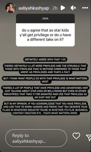 Director Anurag Kashyap’s daughter Aaliyah Kashyap on Wednesday answered a fan on Instagram, who inquired as to whether star kids are privileged. Answering the fan, during anAMA (Ask Me Anything) session, Aaliyah said that she totally agrees that star kids do have privileges.