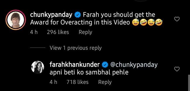 However, the main thing that became the highlight was the exchange of comments between Farah Khan and Chunky Panday. When Chunky saw the video he commented “Farah you should get the award for overacting in this video.” to which she replied “Apni beti ko sambhal pehle.” well it was all in good humour, but the comments that they made to each other went viral on the Internet. So here’s the video that you can check out.