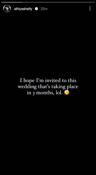 Responding to the recent hypotheses about the couple’s wedding reportedly occurring in the next 3 months, Athiya penned on her Instagram Storie, “I hope I’m invited to the wedding that’s taking place in 3 months. Lol.”