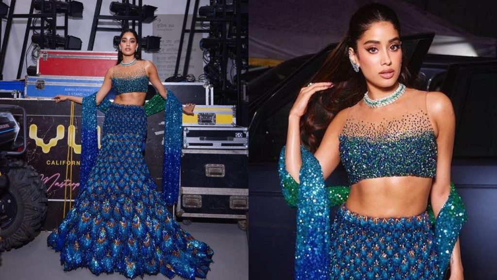 Janhvi Kapoor dazzled in her fully sequined blue lehenga. The sequins created a mesmerizing mermaid tail effect. She paired her look with a diamond necklace featuring emeralds, enhancing her ethereal appearance.