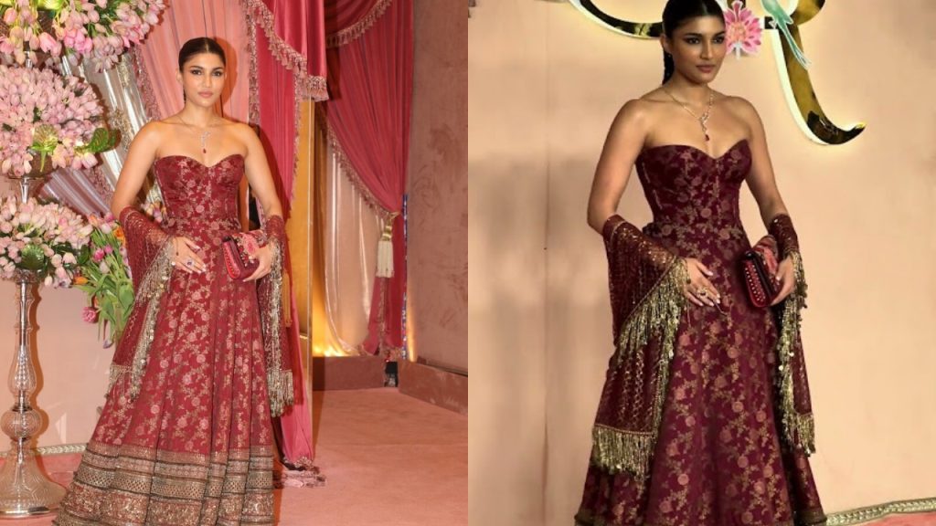 Alizeh Agnihotri dazzled in a red Anarkali with a sweetheart neckline. The design on the Anarkali complemented the tassels on her dupatta. Her attire made her look stunning. She paired the outfit with a matching clutch