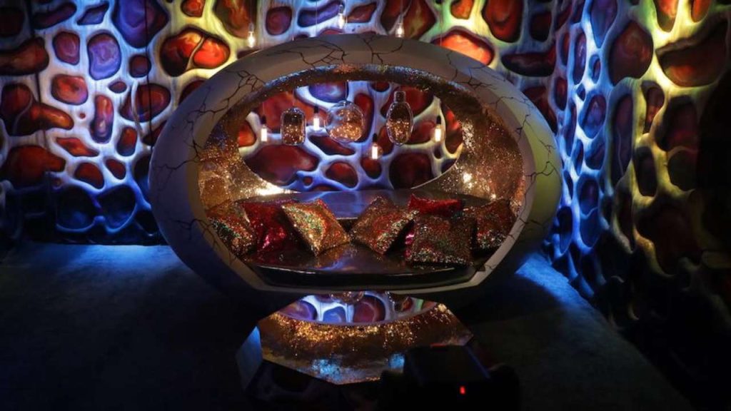 The confession room this time will take to to the outer space. Cracked egg-shaped seating right in the center with overflowing sparkly upholstery. Will make you catch your breath. And is considered as one of the most dramatic spaces of the house.