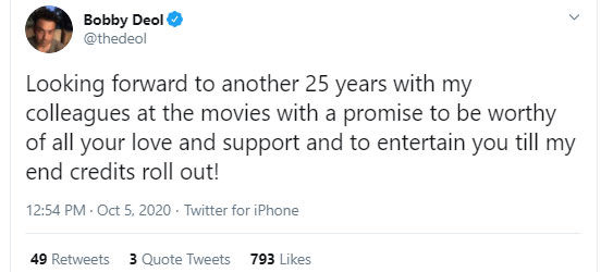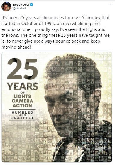 Bobby Deol has completed 25 years in the film industry. On this occasion, he made a special post on social media. He posted his photo showing posters of his films. On the occasion of completing 25 years in the film industry, Bobby Deol wrote another tweet and expressed his desire to work in the film industry and 25 years.