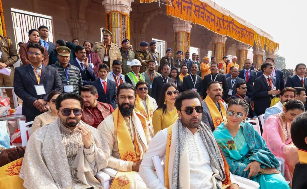 In the morning, Alia Bhatt, Katrina Kaif, Vicky Kaushal, Ranbir Kapoor, and Rohit Shetty arrived at the location.A day before, Kangana Ranaut had arrived at Ayodhya.Along with her spouse Shriram Nene, Madhuri Dixit also arrived at the Ram Temple grounds. In addition to them, the major event featured participation from Madhur Bhandarkar, Prasoon Joshi, Ram Charan, and Rajkumar Hirani. Ayodhya was also visited by seasoned celebrities like Chiranjeevi, Rajinikanth, and Amitabh Bachchan. Before the ceremony, three singers—Sonu Nigam, Anuradha Paudwal, and Shankar Mahadevan—performed special performances.
