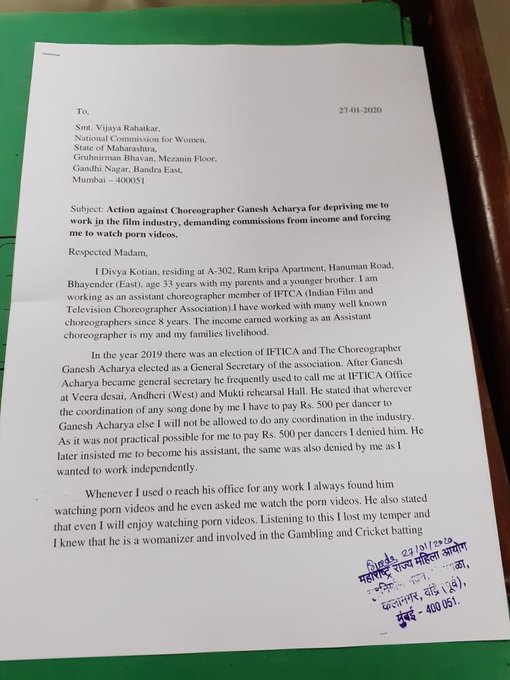 In an exclusive conversation with SpotBoyE a 33-year-old, Divya Kotian have lodged a complaint against Ganesh Acharya.