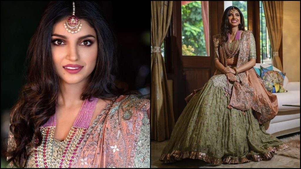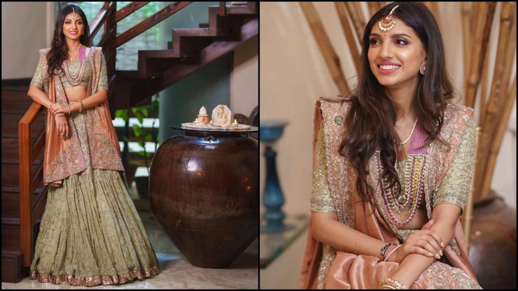 The actress is looking very pretty by donning a mint green lehenga choli designed by Jayanti Reddy with heavy threadwork and a brown heavy dupatta. This matching mask seems like the need of the hour during the pandemic.