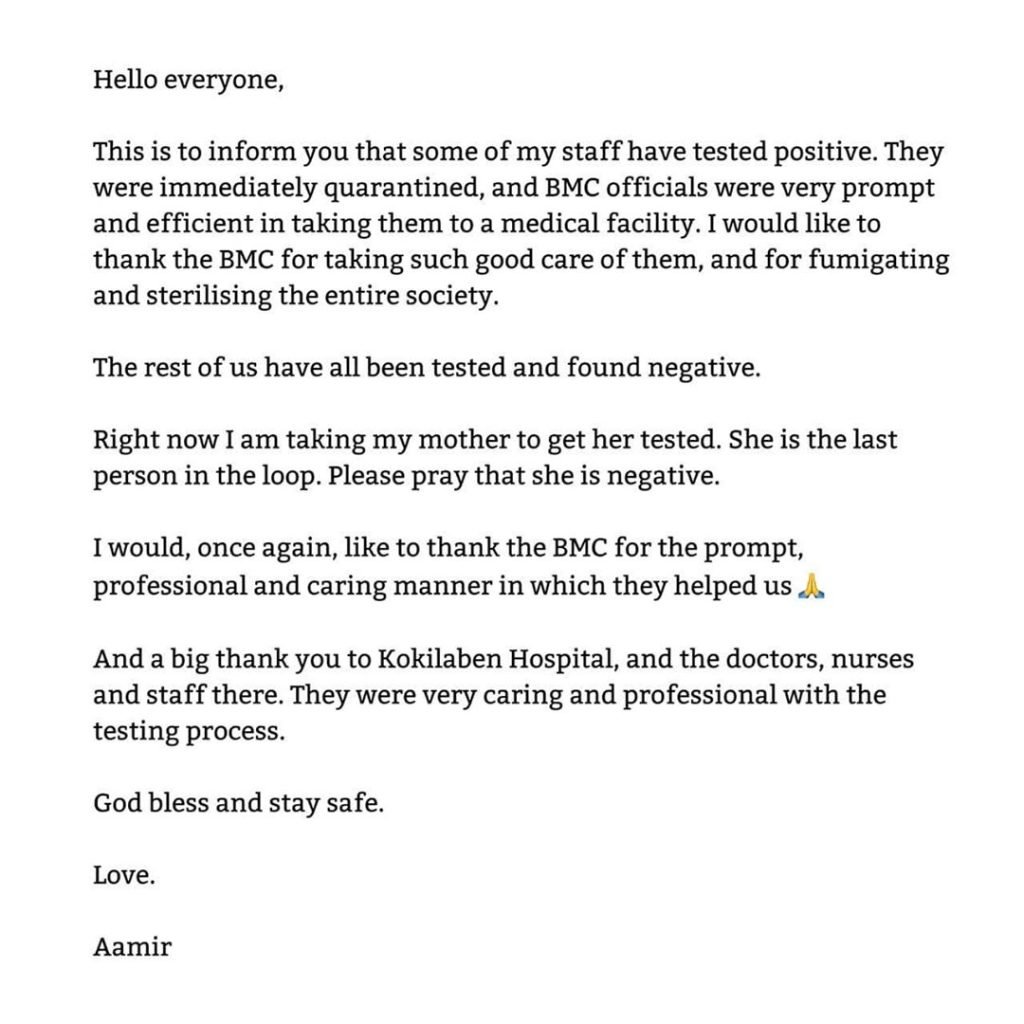 Actor Aamir Khan has shared a letter on Twitter, in which he has given information about this. He wrote, “I want to inform you that some of my staff members are corona positive. They have been quarantined immediately upon discovering this. BMC officials immediately took them to the hospital, taking effective steps.”