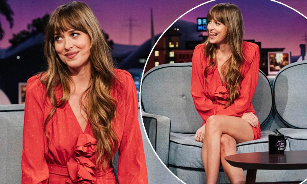 Handled like a pro! Dakota Johnson decided to wear a tiny red Magda Butrym dress for her appearance on The Late Late Show with James Corden , but it looks like the hemline was a few inches shorter than she originally planned.