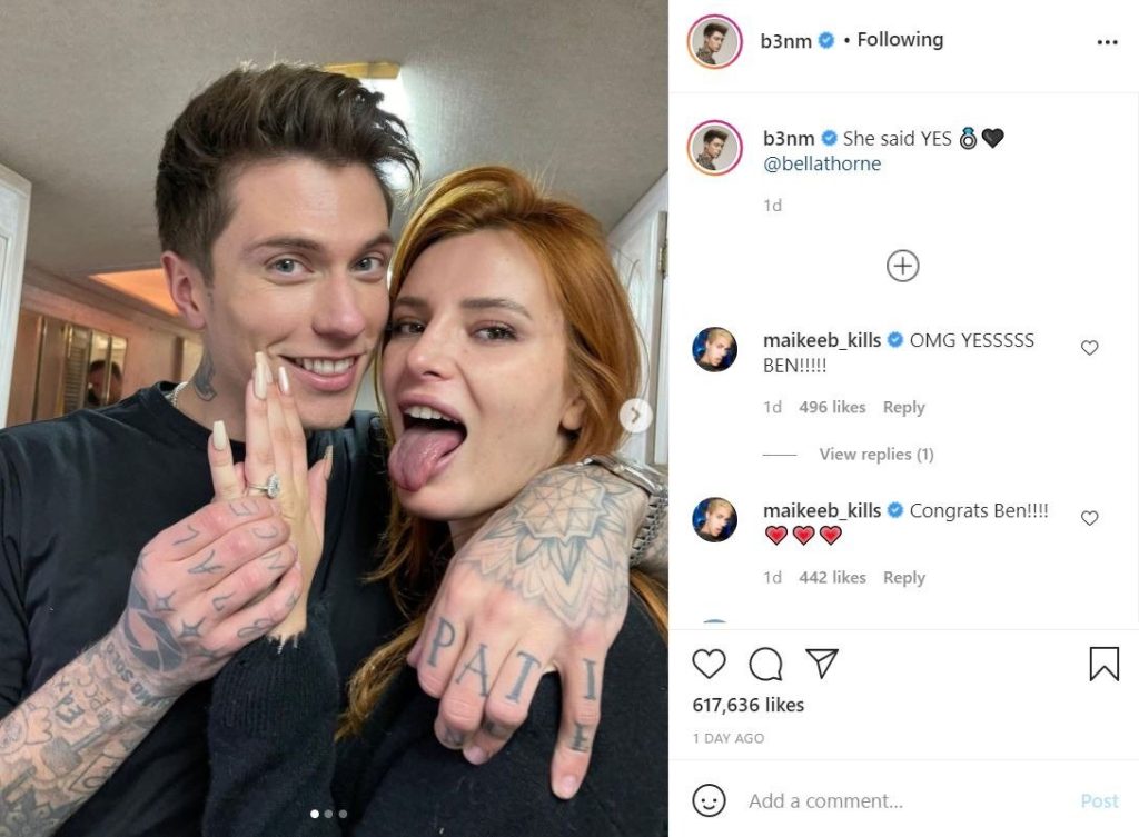 At the beginning of the year, however, Bella and Benjamin still seemed totally happy together. In February, they treated themselves to a little love vacation in the Italian capital of Rome – and were photographed there. The 24-year-old and the Italian-born even held hands as they strolled the streets. Things will turn out with them nobody knew that because a while ago Bella said “I got so lucky with my Ben. He’s really just the perfect specimen and I honestly don’t know how I got so blessed with him,” Also Ben an Italian pop star, showing off his engagement ring took to his Instagram to caption the post as “She said YES 💍🖤 @bellathorne,” But heartbreaking to know that the couple had split after dating 3 years with each other.