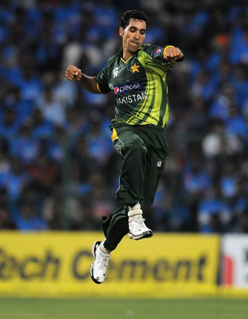 Umar Gul of Pakistan celebrates the wicket of Ravindra Jadeja of India during the 1st Airtel T20I Match between India and Pakistan held at The M Chinnaswamy Stadium in Bengaluru on the 25th December 2012..Photo by Pal Pillai/BCCI/SPORTZPICS ..Use of this image is subject to the terms and conditions as outlined by the BCCI. These terms can be found by following this link:..http://www.sportzpics.co.za/image/I0000SoRagM2cIEc