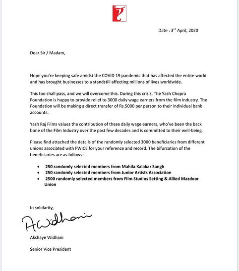 Yash Raj Studio will give one and a half crores to the seating department, carpenters, lighting, junior artists, workers associated with the spot. For this, the Yash Raj banner is reaching thousands of daily wage workers and their families, so that their daily needs are met and they do not have to face financial difficulties. They also transferring Money directly to their accounts to help daily workers.