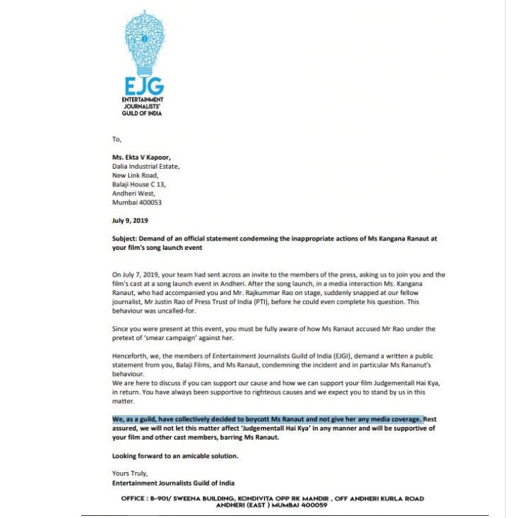 Now, the Entertainment Journalists’ Guild of India has decided to boycott Kangana Ranaut, a delegation from the group told producer of film Judgementall Hai Kya, Ekta Kapoor on Tuesday, two days after the actor’s spat with a PTI journalist at a promotional event. Members of the Guild also demanded a public apology from both Kapoor and Ranaut, journalists present at the meeting said. The country’s biggest news agency PTI has already boycotted the Kangana Ranaut. High officials of the agency have confirmed this. They have taken this decision while supporting their employee Justin Rao.