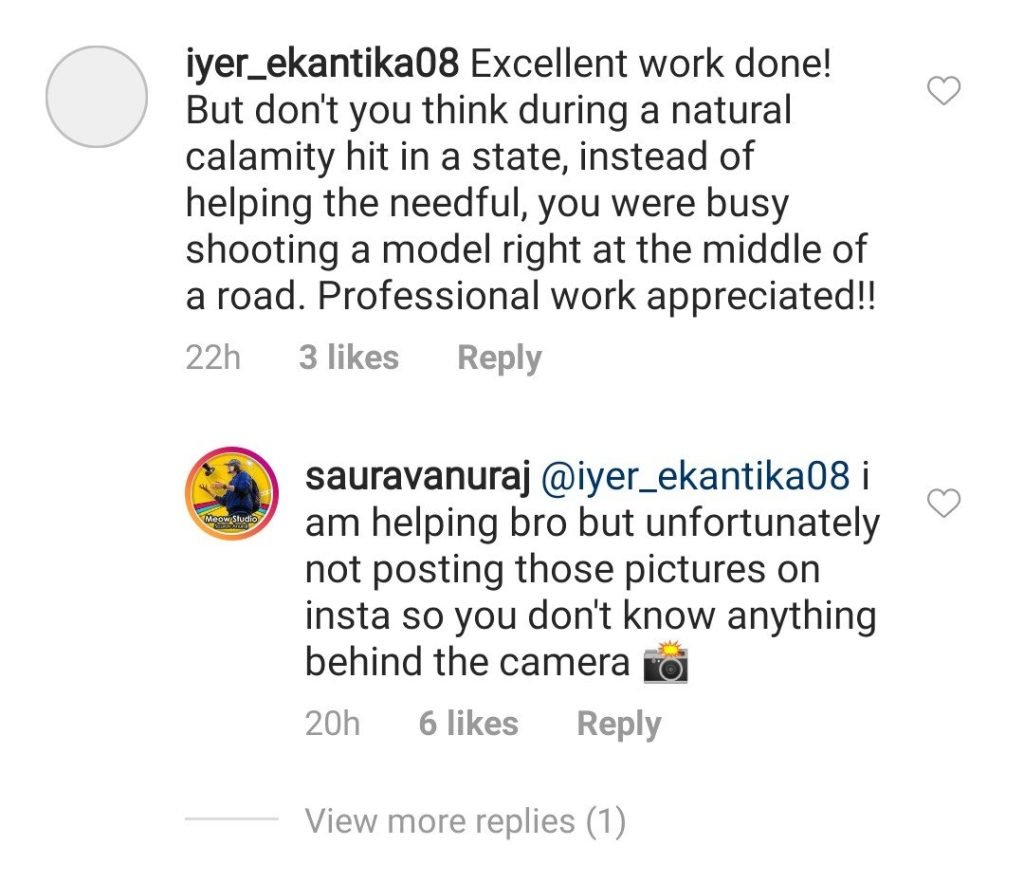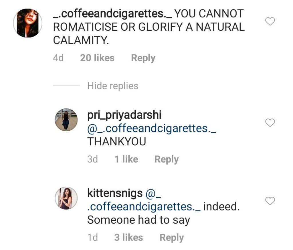 It is a very debatable discussion to get on a point if her post during a distastrous condition was right or wrong. To the ones supporting her and the photographer consider it completely creative and artistic and support them by stating the fact that they were just working. While on the other hand, people criticising them question if seeking attention was that important than helping the affected ones in the floody situations. As a revert to this, few of the supporters shouted back by saying if the ones who are extra- cautious had put any efforts themselves in helping or not?