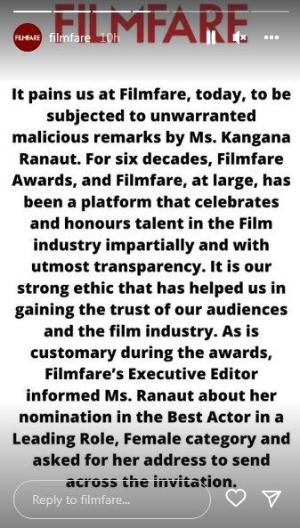 Soon after this, the Queen actress was quick to respond and she also penned down a note on her social media platform that reads “@filmfare has finally withdrawn my best actress nominations, thanks to everyone who supported me in this fight against the corrupt system but this doesn’t stop me from taking legal action against them…my endeavor is to put an end to these unethical practices and stop such malicious award shows…see you in court @filmfare.”
