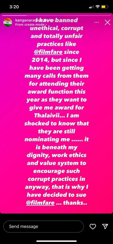 She further said “I’ve banned unethical, corrupt, and totally unfair practices like @filmfare since 2014, but since I have been getting many calls from them for attending their award function this year as they want to give me an award for Thalaivii… I am shocked to know that they are still nominating me. It is beneath my dignity, work ethics, and value system to encourage such corrupt practices in any way, that is why I have decided to sue @filmfare … thanks,”
