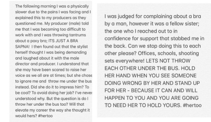 Sapna told how the producer of her film didn’t care a fig for her health and asked her to wear an underwired bra. She also revealed how women sometimes also play an important role in making other women feel harassed. She mentioned that even her female stylist on the sets declared her behaviour ‘difficult’ when she said the bra caused her chest pain. The actress narrated her incident as: