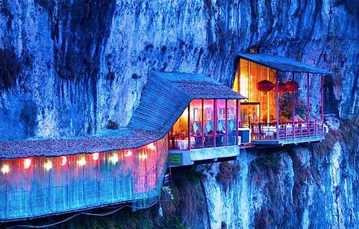 There is a hanging restaurant Fangweng, in the Happy Valley of Xining Gorge in the Chinese province of Hubei, which also offers, in addition to food, stunning views from the cliff on which it is located. It is worth noting that due to its unusual location, this place is not for the faint of heart.