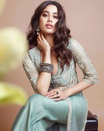 Janhvi Kapoor attends the celebrations wearing a pastel blue suit combination that includes a full-sleeved kurta with elaborate white embroidery that resembles a jacket. The traditional ensemble is given a modern twist by the deep, plunging neckline, straight-fit slacks, and front slit, which makes it an ideal choice for sangeet festivities.