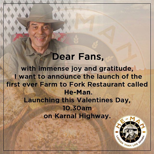 Apart from this Sharing to his twitter account the actor wrote “Dear friends, after the success of my restaurant “ Garam Dharam Dhaba” now I’m announcing the first-ever Farm to Fork restaurant called “He-Man”, friends, I truly appreciate your love, respect and belonging towards me .love you all…your Dharam,” he wrote.