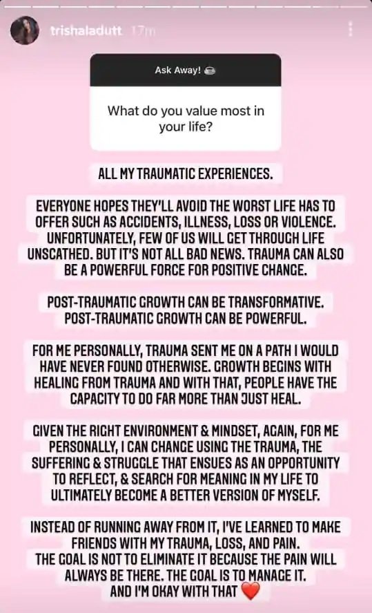 Trishala is a New York-based psychotherapist. And Recently in a Q&A session, on Instagram. She was asked that What do you value most in life? And to this, she opened up about facing traumatic experiences. She said that everyone avoids the worst things in life such as accidents, illness, loss, or violence. but in these negative incidents, there is also something positive. These things come in life to make us strong. Thereby making you become a better version of yourself.”