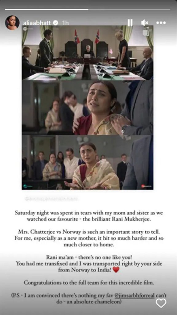 Actress Alia Bhatt dedicated her Saturday night watching Mrs. Chatterjee Vs. Norway with her mother and sister, and she couldn’t be happier. The diva was all love for Rani Mukerji’s work in her most recent movie, which closely examines a mother’s battle to reclaim her children after they were forcibly stolen from her. On Sunday, Alia Bhatt posted an Instagram story reviewing the movie.