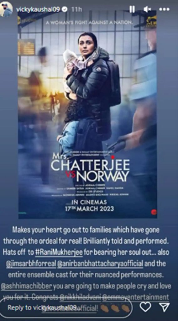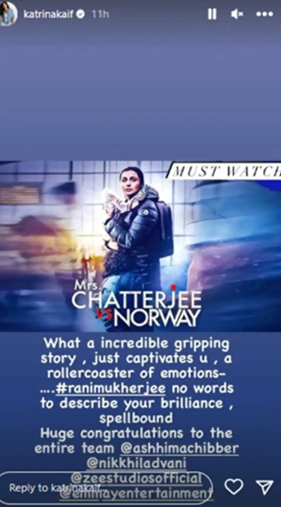 Katrina Kaif published a picture of the movie’s poster to Instagram Stories along with the message: “What an incredibly gripping story, just captivates you, a rollercoaster of emotions – Rani Mukerji no words to describe your brilliance, spellbound. Huge congratulations to the entire team,” and tagged director Ashhima Chibber and producer Nikkhil Advani. She also added the caption, “Must watch.”
