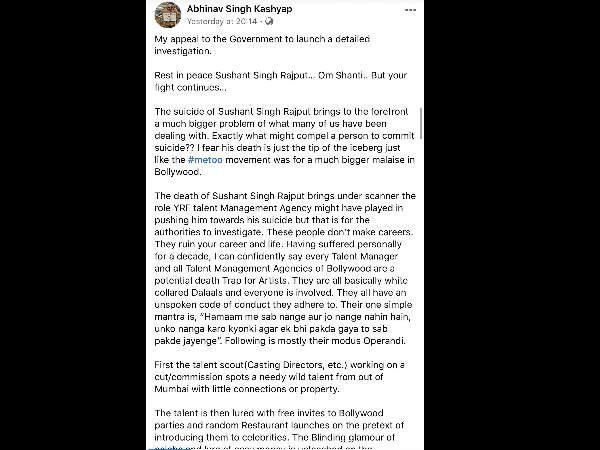 So this is not a threat, it’s an open challenge. Sushant Singh Rajput has moved on and I hope he is happier wherever he is but I will make sure that no more innocent will kill himself over lack of work with dignity in Bollywood. I hope suffering actors and creative artists will share my post on various social media platforms as will the media and people who patronize the entertainment industry.