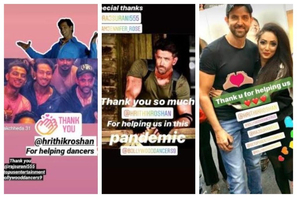 Bollywood songs dancer and Coordinator Raj Surani shared that Hrithik Roshan has assisted 100 dancers in this difficult time. There are many who went back to their homes while so many of them finding it difficult to pay rent. In this hour of need, Hrithik Roshan has come forward to help them in this very crucial time. After the background dancers came to know that Hrithik helped them out by transferring money to their accounts they were overwhelmed with joy. Dancers are extremely thankful to him for his support during the COVID crisis”. These dancers thanked later thanked the actor, by posting messages to the social media accounts.