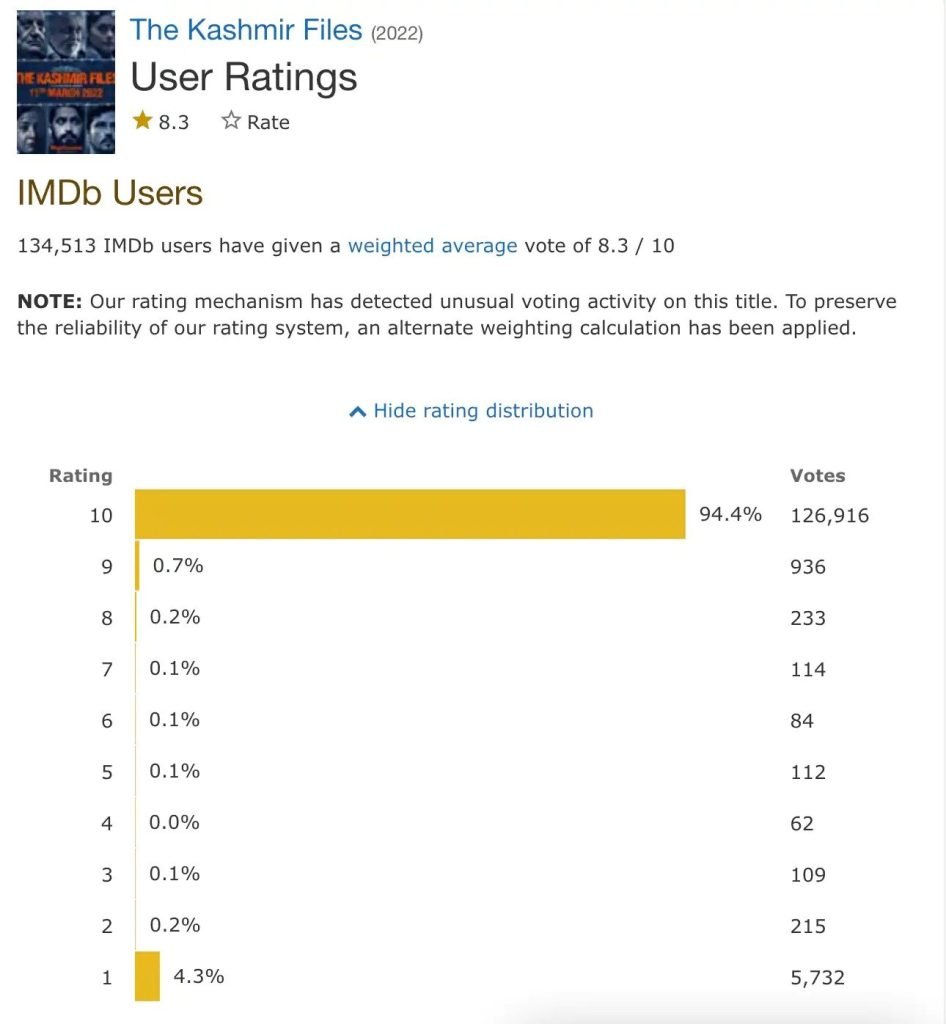 Now above all this, another thing that emerged is the changes in the rating of the film’s page. And therefore IMDB, which is a popular website that hosts film and television audience reviews, has changed its rating system. On the film’s rating page, it is clearly mentioned: ‘Our rating mechanism has detected unusual voting activity on this title. To preserve the reliability of our rating system, an alternate weighting calculation has been applied.’