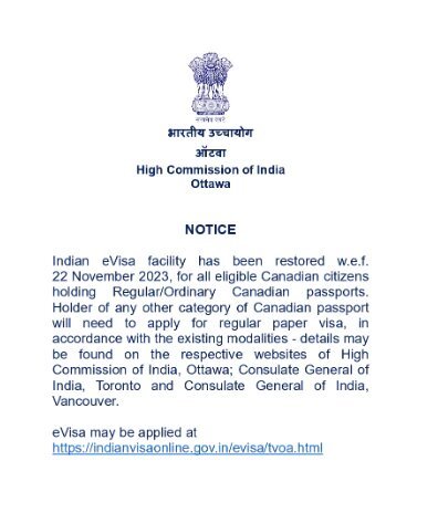 As of Wednesday, India has reinstated e-visas for Canadian nationals in all categories. In a statement released on Wednesday morning, the Indian High Commission in Ottawa announced that, as of November 22, “all e-visa services have been restored” and that this would apply to “Canadian citizens holding regular/ordinary Canadian passports.”