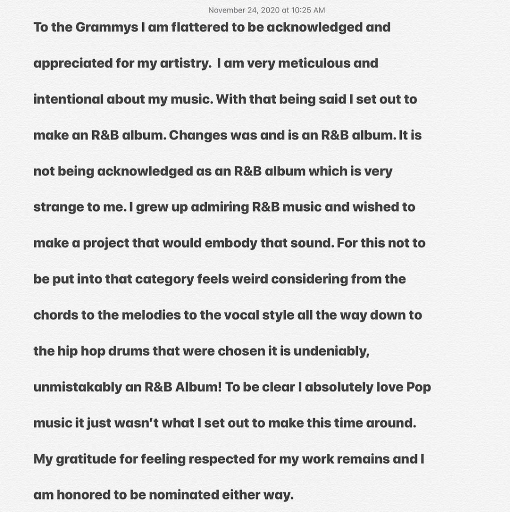 But it feels like Justin is not satisfied with the category chosen for his album “Changes”. Because in response to this long back in November, said that his song has not been put in the right category. Later this young singer took to his Instagram account and said “I am flattered to be acknowledged and appreciated for my artistry. I am very meticulous and intentional about my music. With that being said, I set out to make an R&B album. ‘Changes’ was and is an R&B album. It is not being acknowledged as an R&B album, which is very strange to me.”