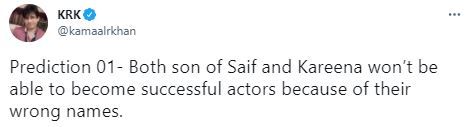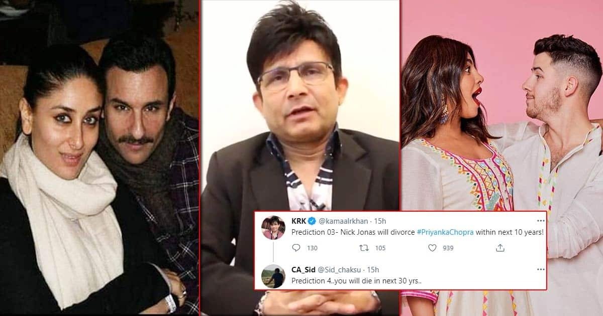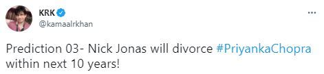 And now the latest issue is about Priyanka and Nick. Recently, KRK predicted that both of them will have divorce in the next 10years. Soon after netizens read his tweet, they expressed their anger. In fact, many users also trolled him. KRK took to his social media account and predicted Priyanka Chopra and Nick Jonas’ divorce in the next 10 years. His tweet reads “Prediction 03- Nick Jonas will divorce #PriyankaChopra within next 10 years!” On the other hand, he also made predictions on Kareena Kapoor Khan and Saif Ali Khan’s sons. His tweet read Prediction 01- Both sons of Saif and Kareena won’t be able to become successful actors because of their wrong names.”