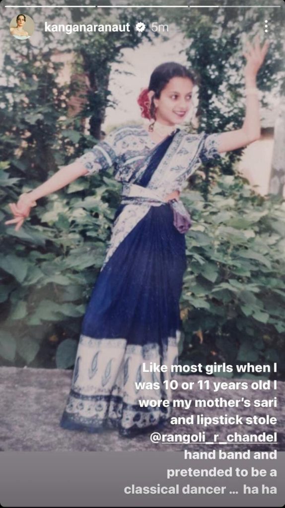 Kangana wrote, “Like most girls when I was 10 or 11 years old I wore my mother’s sari and lipstick stole @rangoli_r_chandel hand band and pretended to be a classical dancer… ha ha.”