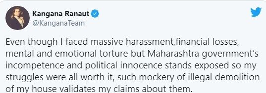 The war of words between Kangana and the Shiv Sena leader started surfacing after the actress compared Mumbai with Pakistan-occupied Kashmir(POK). She also faced a backlash, after BMC demolished her office. The actress attacking them quoted “Even though I faced massive harassment, financial losses, mental and emotional torture but Maharashtra Government’s incompetence and political innocence stands exposed so my struggles were all worth it, such mockery of illegal demolition of my house validates my claims about them.,”