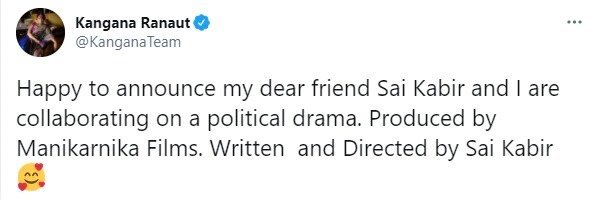 Helmed by Sai Kabir and Produced by Manikarnika Films. This film will be one of its kind. And the Tanu weds Manu actress showing her excitement towards the film confirmed that she is working on this project. She stated that the film will cover the significant moments of Indian political history including Operation Blue Star and The Emergency. She also took to her Twitter account to announce the same. Kangana took to her Twitter account and wrote. “Happy to announce my dear friend Sai Kabir and I are collaborating on a political drama. Produced by Manikarnika Films. Written and Directed by Sai Kabir.