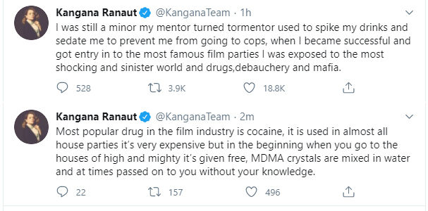 Kangana tweeted, “I was still a minor my mentor turned tormentor used to spike my drinks and sedate me to prevent me from going to cops, when I became successful and got entry in to the most famous film parties I was exposed to the most shocking and sinister world and drugs,debauchery and mafia.” Kangana’s tweet comes out viral and once again the black world of the film world has been questioned.